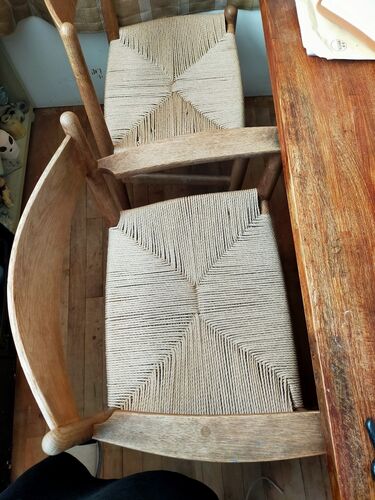 さて、ワシは道具箱の中からクリップを発掘いたしました↓ コレを何に使うのかと言うと… こちらでございます↓ 今から十数年前?に自分で手直ししたハンス・ヴェグナーの椅子二脚。 そもそも買ったのは今から30年以上前でして。 世界的な椅子コレクターの方…